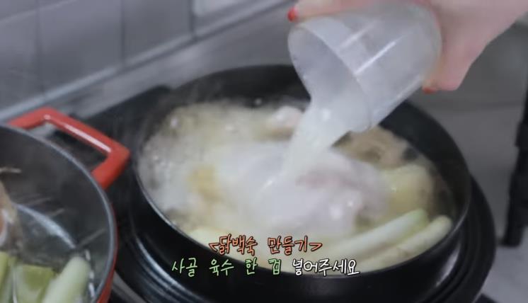 2. 굵은 소금으로 닭을 씻고 육수를 부은 냄비에 넣는다.