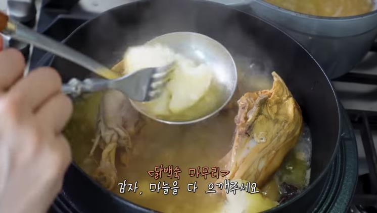 3. 생강 두 알, 파 적당량, 마늘7~8알, 감자 두 알을 넣고 함께 끓인다.