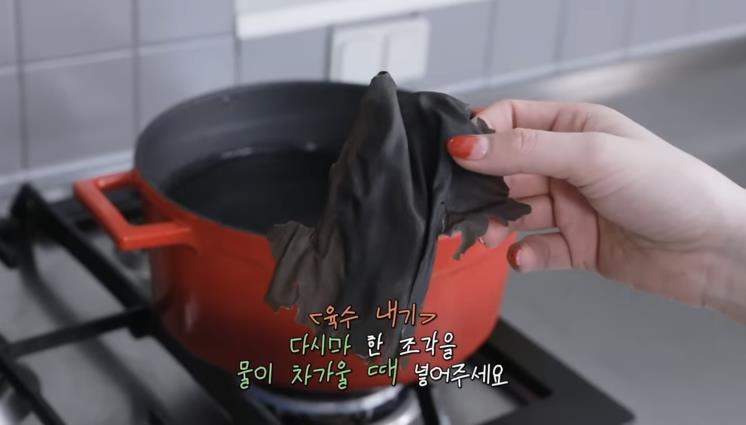 4. 육수가 끓기 시작하면 사골 국물도 한 컵 넣어준다.