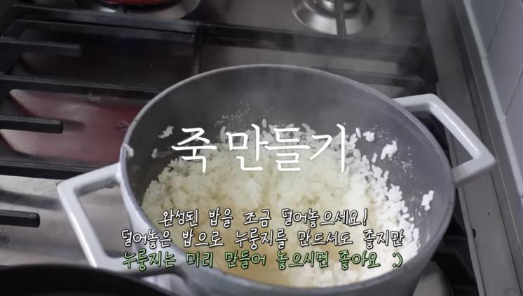 2. 밥을 적당히 덜어낸 뒤 육수를 붓고 끓여 죽을 만든다.