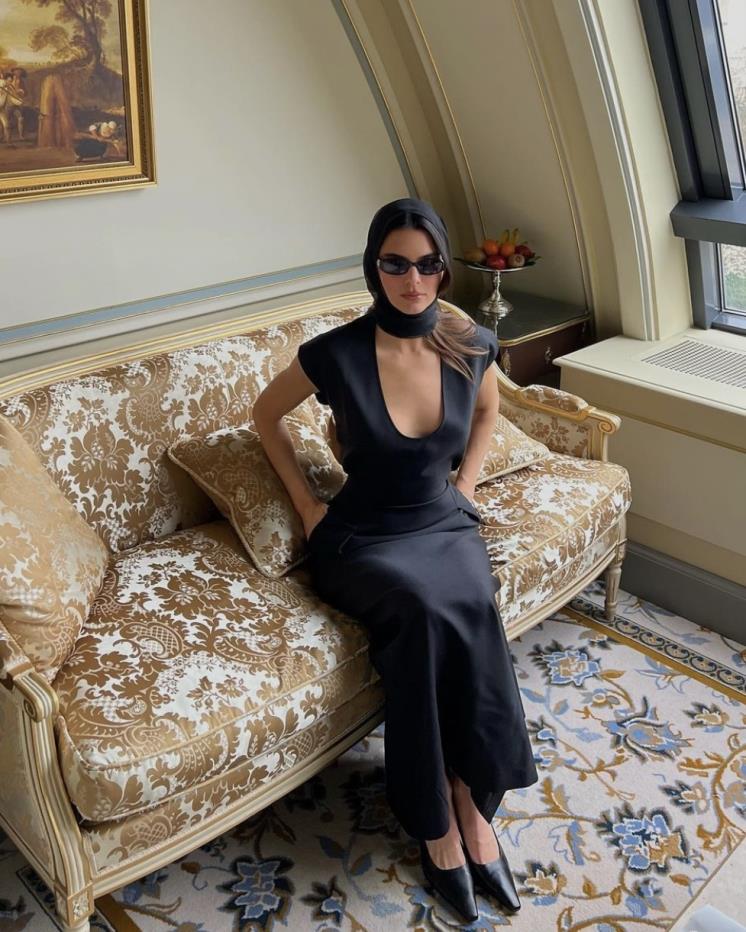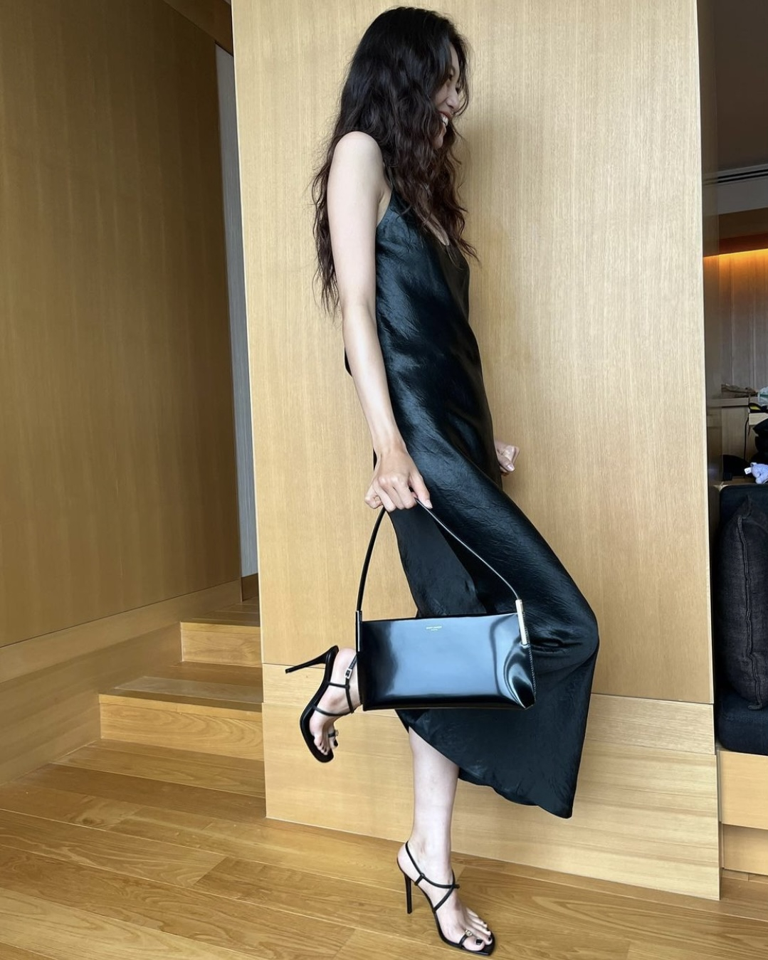 모델 같은 프로포션을 가진 김도연도 고급스러우면서 클래식한 패션을 잘 보여주는 스타 중 하나죠. 새틴 소재의 롱 드레스에 블랙 샌들을 매치한 이 룩도 클래식한 올드 머니 룩으로 볼 수 있겠네요.