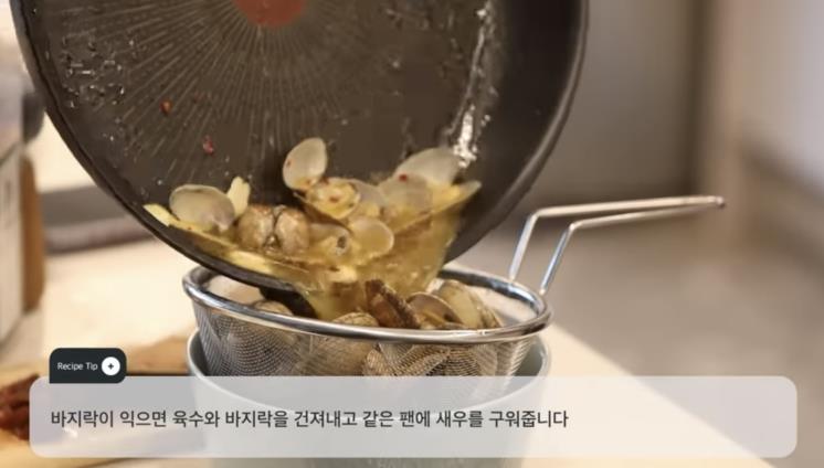3. 바지락이 입을 벌리면 그릇에 모두 덜고, 같은 팬에 새우를 익혀준다.
