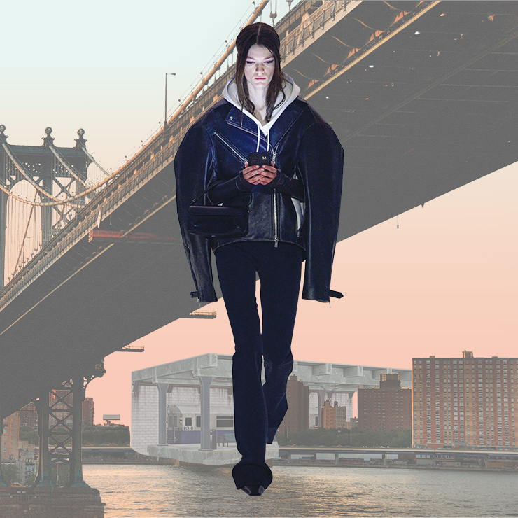 일상의 우리처럼 스마트폰을 두드리며 런웨이에 등장한 쿠레주 쇼의 모델! 바이커 재킷과 후디드 스웨트셔츠를 매치한 룩 또한 리얼하다.