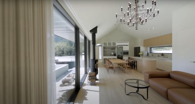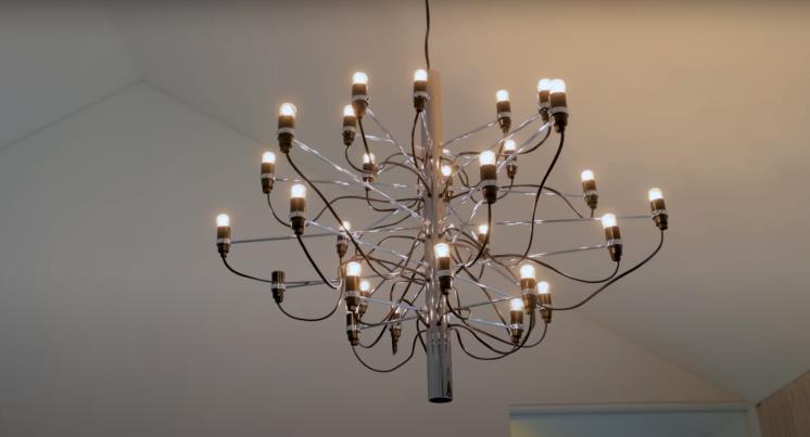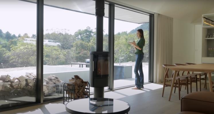 주방 겸 거실 안쪽에는 눈 오는 날 창밖을 보며 불을 땔 수 있도록 난로가 설치되어 있다. 그 옆으로는 구독자와 함께 골랐다는 넓은 가죽 소파와 블랙과 골드 포인트가 들어간 커피 테이블, 촛불이 일렁이는 듯한 FLOS사의 조명까지. 편안하고 고급스러운 무드로 가득하다.
