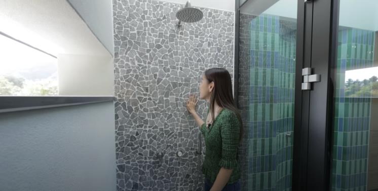 화장실은 높은 층고와 어울리는 세로형 컬러 타일이 포인트인데 천장에도 창이 있어 씻으면서 하늘을 감상할 수 있다. 특히 바로 옆 오픈 테라스에도 샤워 시설이 있어 여름에는 휴양지에서처럼 야외 샤워를 즐길 수도 있다.