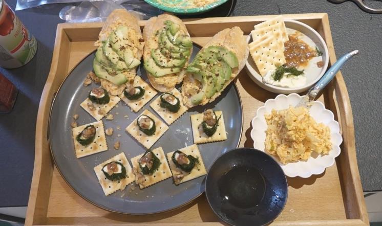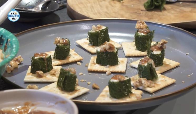 안주, 감태 치즈 크래커를 소개했다. 김밥김 사이즈의 생감태에 대용량 크림치즈를 단무지 사이즈로 잘라 김밥처럼 말고, 참치내장젓갈을 올린 뒤, 밑에 담백한 맛의 크래커 깔아주면 끝. 치즈 위에 호두나 아몬드와 같은 견과류를 올리고 달콤한 꿀을 한스푼 떠 뿌려주면