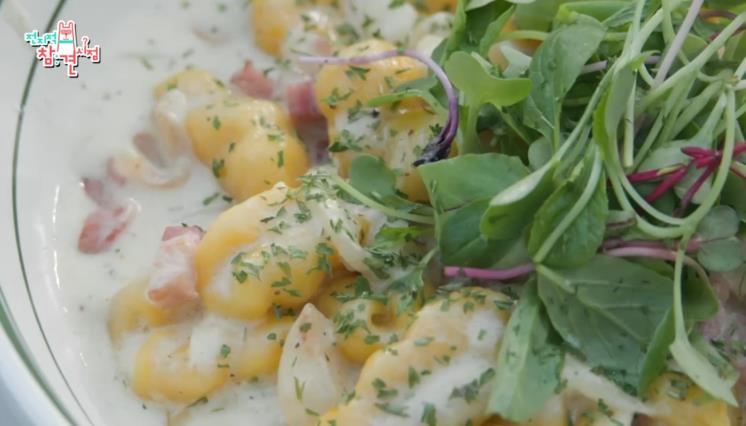 이영자는 이날 뇨끼 본연의 모양을 내기 위해 빨래판을 활용하는 아이디어를 냈다. 전현무는 이를 ‘K 뇨끼’라 칭했다고. 그런 다음 뇨끼를 잘 삶고, 기름을 잘 두른 팬에 한번 구워 겉을 바삭하게 하고 채썬 양파, 구운 베이컨에 우유, 생크림, 파르미지아노 레지아노 치즈를 갈아 뭉근하게 끓인 크림 소스에 퐁당 담궈 둘도 없는 K크림 뇨끼를 만들었다. 모양도 예쁜데 맛까지 좋아서 이국주 어머니가 만족해했다는 후문. 뇨끼를 만들기 힘들다면 냉동 뇨끼를 활용하는 것도 방법이다.
