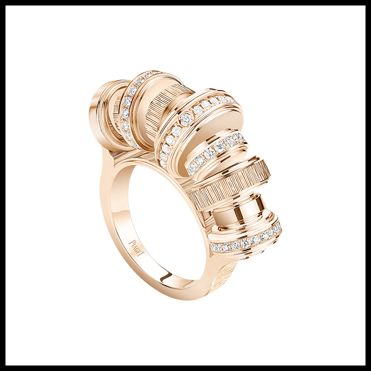 피아제 포제션 링 피아제만의 탁월한 금 세공 기술로 실현된 5개의 터닝 밴드가 회전하며 다이아몬드가 광채를 발한다.