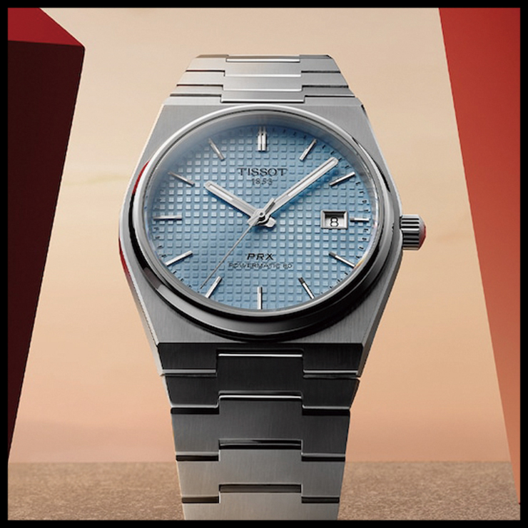 티쏘 PRX 파워매틱 80 35MM 아이스 블루 생생한 색감과 독특한 와플 패턴이 돋보이는 다이얼이 세련된 무드를 자아낸다.