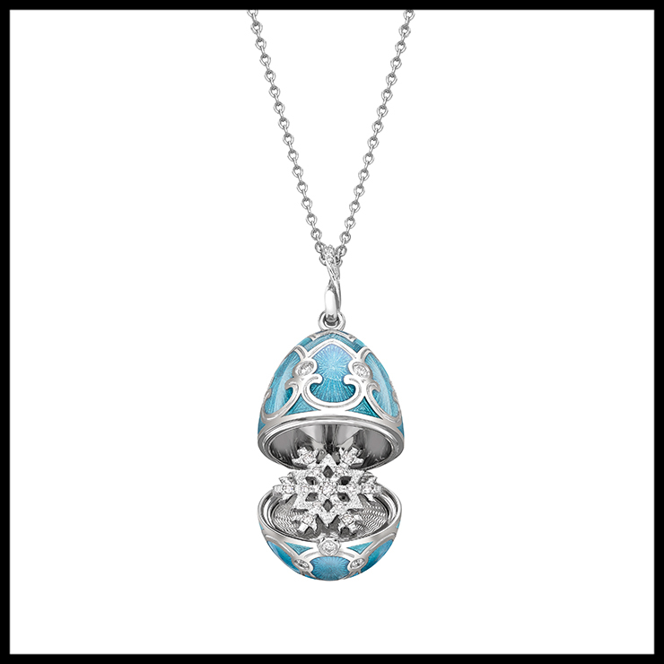 파베르제 스노우 에그 로켓 네크리스 화이트 다이아몬드가 세팅된 네크리스. 모두 수작업으로 제작해 파베르제의 전통 기술을 오롯이 담고 있다.