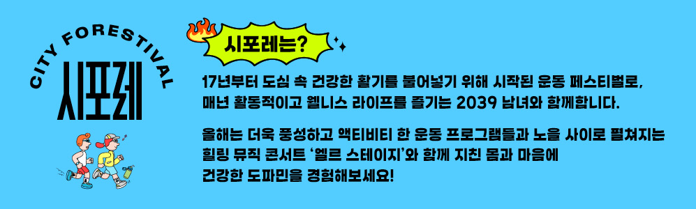 A. ‘시포레 응원단’은 운동과 음악을 좋아하고 즐기는 크리에이터로서, ‘시티포레스티벌 2025’ 행사를 널리 알리고, 행사에 직접 참여하며 함께 즐기는 서포터즈입니다.
