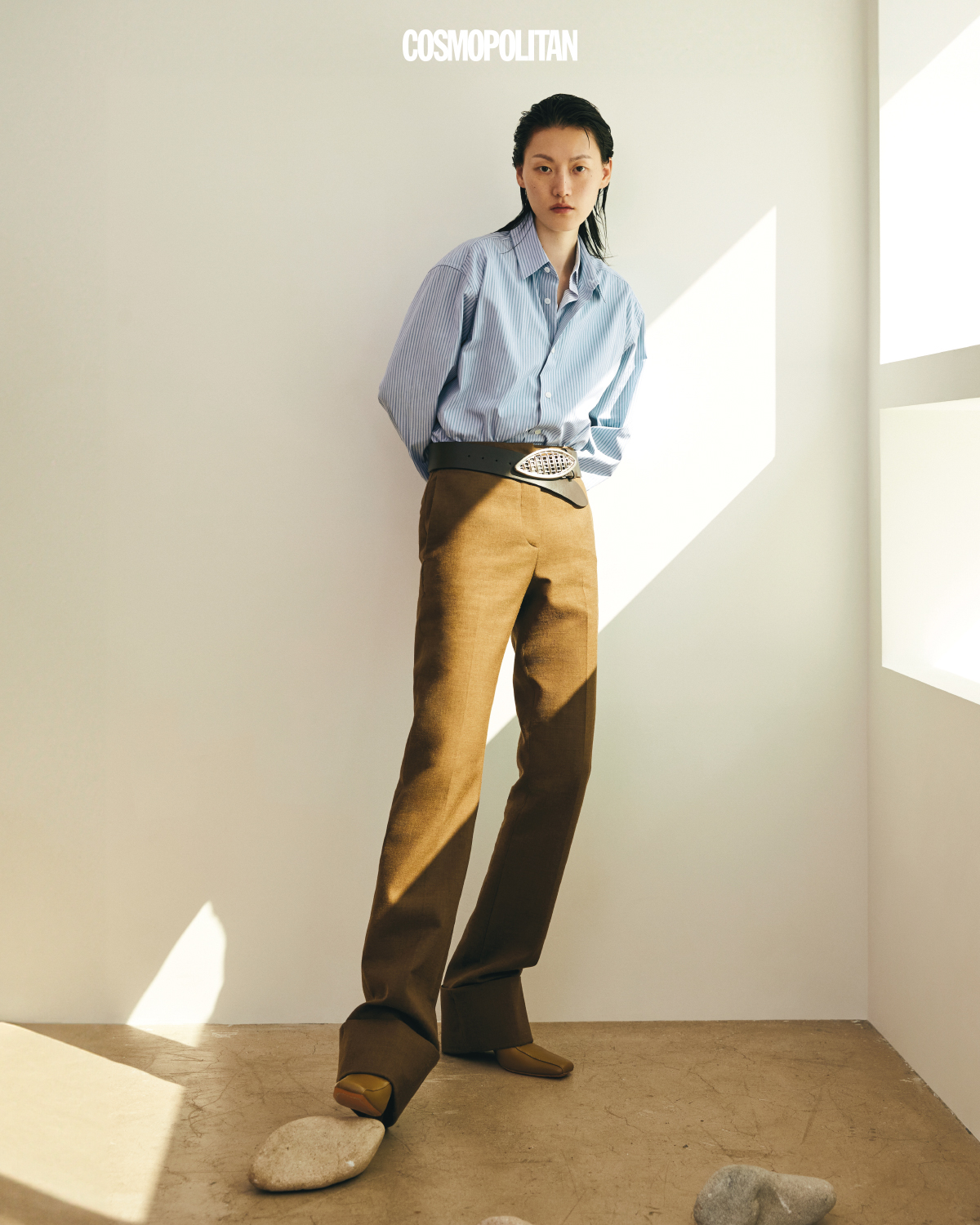 포폴린 더블칼라 셔츠 1백45만원, 울 팬츠 1백61만원, 벨트 1백39만원, 뮬 1백39만원 모두 Tod’s.