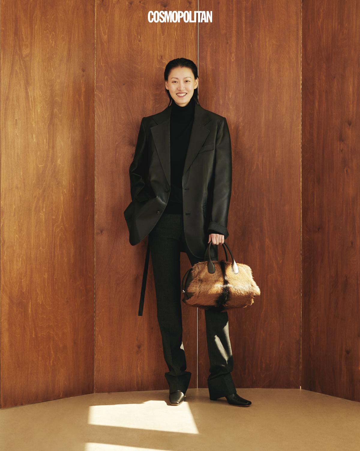레더 블레이저 8백60만원, 울 터틀넥 1백10만원, 울 팬츠 1백61만원, 다르세나 백 6백만원, 앵클부츠 1백39만원 모두 Tod’s.