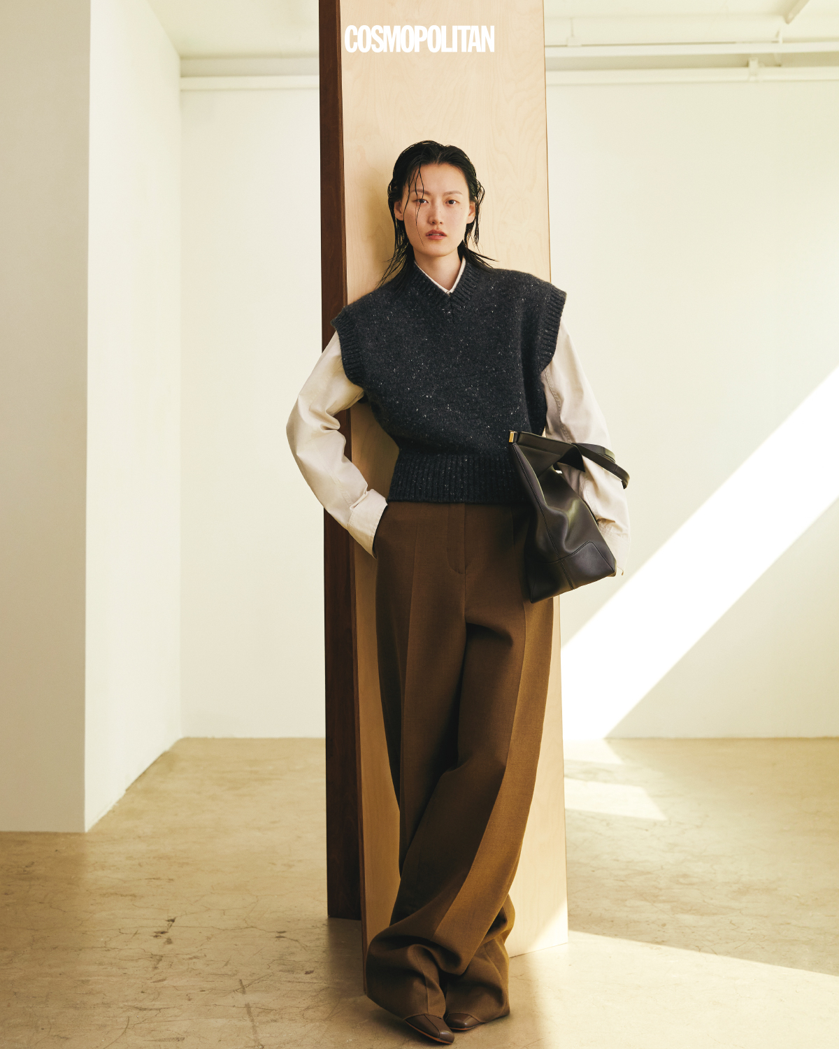울 니트 베스트 1백45만원, 포폴린 셔츠 1백24만원, 울 와이드 팬츠 1백61만원, 디아이 폴리오 백 가격미정, 뮬 1백39만원 모두 Tod’s.