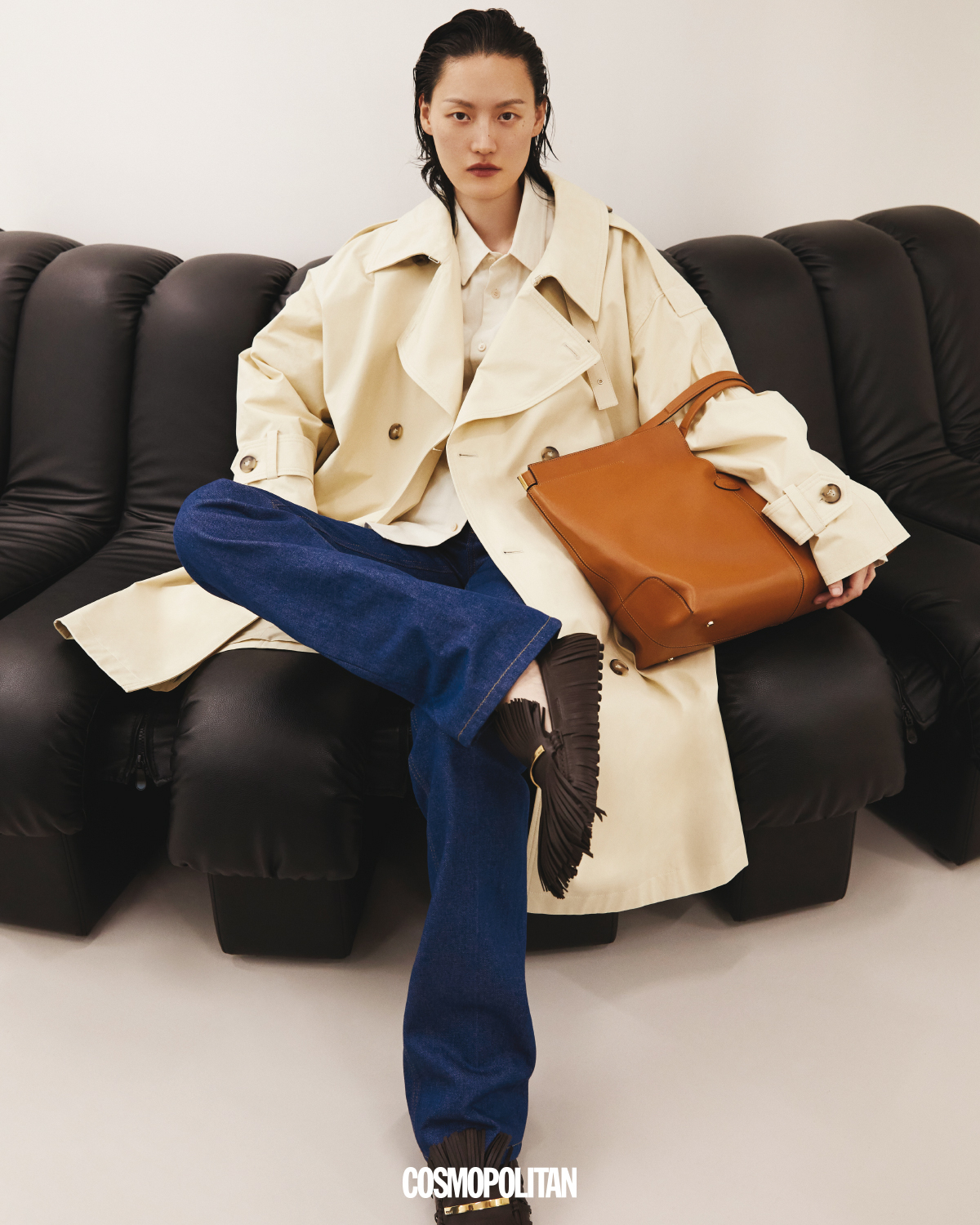 트렌치코트 5백39만원, 포폴린 셔츠 1백24만원, 데님 팬츠 66만원, 디아이 폴리오 백 2백60만원, 요키 고미노 슈즈 1백39만원 모두 Tod’s.