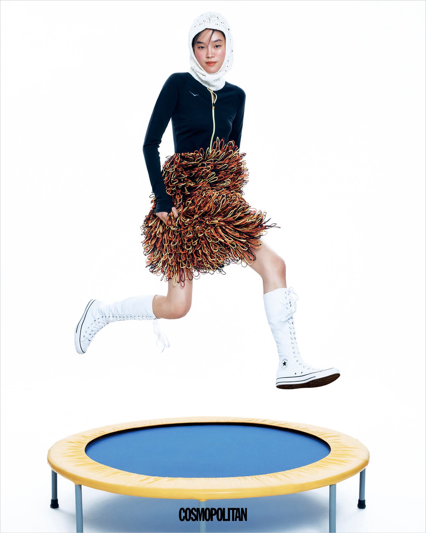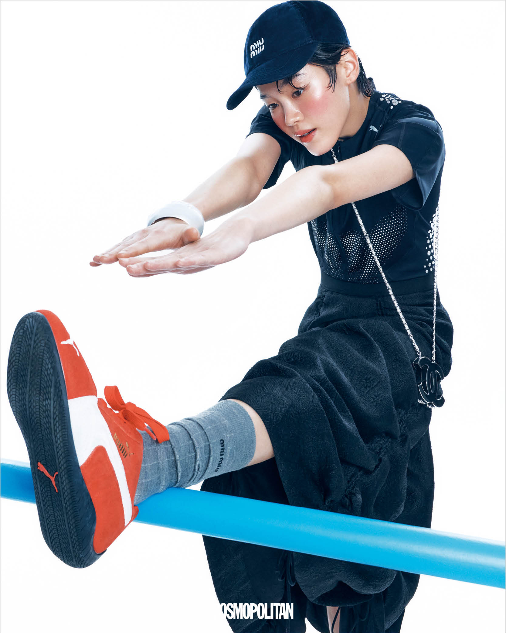 보디슈트 가격미정 PumaxCoperni. 셔링 스커트 가격미정 Sea New York. 볼캡 93만원, 양말 54만원 모두 Miu Miu. 목걸이, 뱅글 모두 가격미정 Chanel. 스피드캣 스니커즈 13만9천원 Puma.