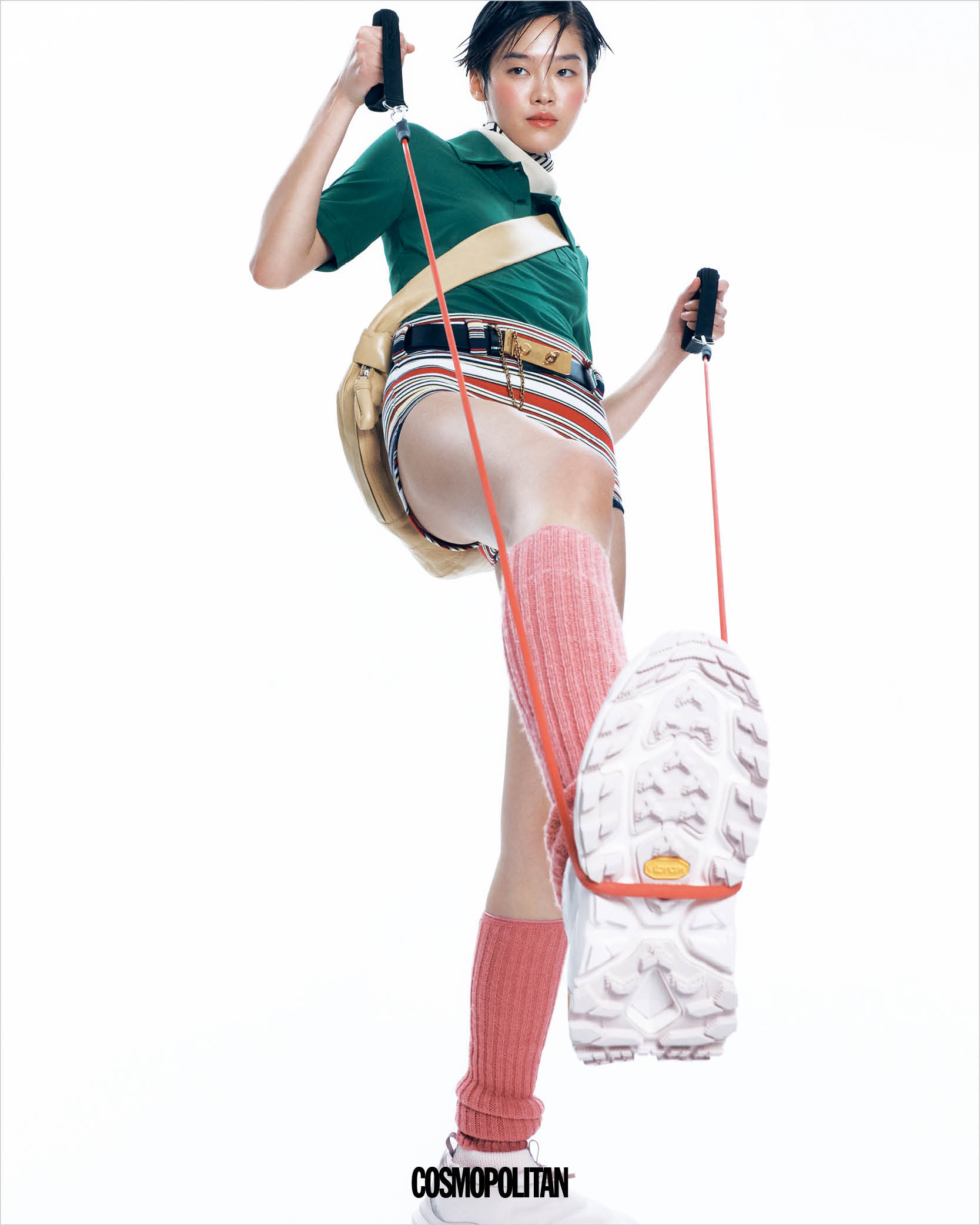 피케 셔츠 35만9천원 Lacoste. 쇼츠, 벨트 모두 가격미정 Prada. 스카프 25만원 Toteme. 크루아상 백 2백58만원 Lemaire. 레그 워머 4만8천원 Repetto. 패딩 슈즈 25만9천원 Hoka.